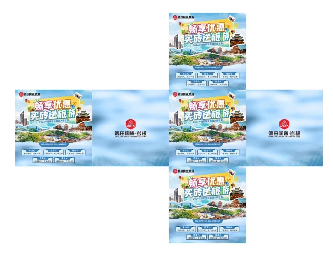 為了迎接暑期銷售旺季節(jié)點(diǎn),更好地配合廣大經(jīng)銷商家人們開展促銷活動(dòng),營造濃郁的促銷氛圍,搶占市場,德田陶瓷發(fā)起“暢享優(yōu)惠,買磚送旅游”暑期促銷活動(dòng),并推出系列促銷方案及物料,含拱門、單張、展架、貼紙等整套源文件。